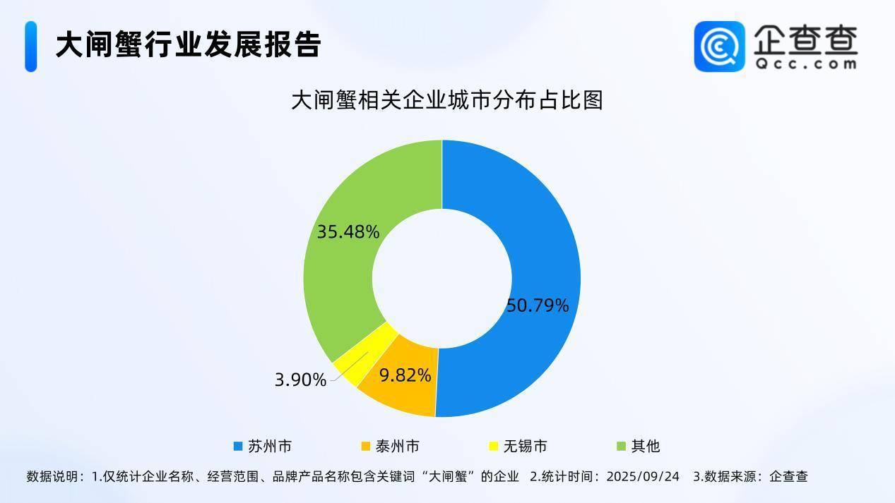 企查查数据显示,从地区来看,大闸蟹相关企业密集分布在华东地区,且以江苏省相关现存企业居多,其中苏州市占全国大闸蟹相关企业存量份额的50.79%,泰州市、无锡市分别占比9.82%、3.90%,紧随其后。