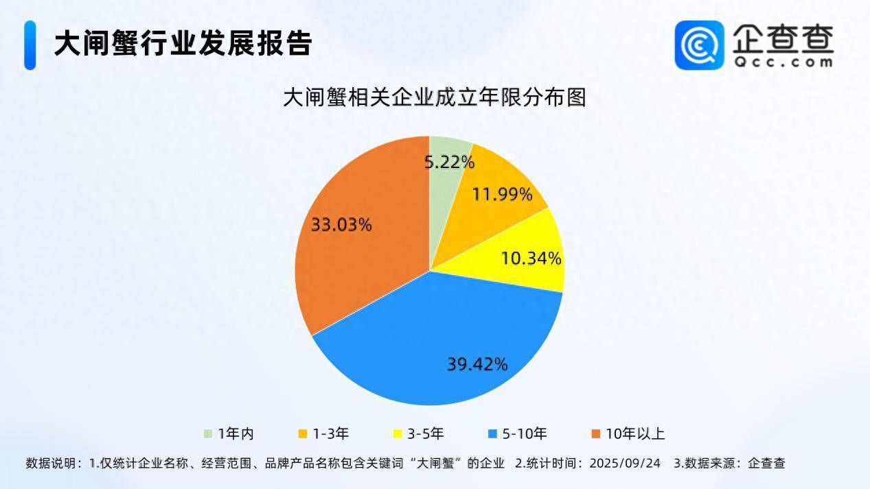 企查查数据显示,国内现存大闸蟹相关企业7970家。从经营时间来看,大闸蟹相关企业多为老牌企业,成立年限在5-10年的相关企业最多,占比39.42%。成立年限在10年以上的相关企业占比33.03%。注册量方面,2024年全年注册相关企业489家,截至目前,今年已注册289家。